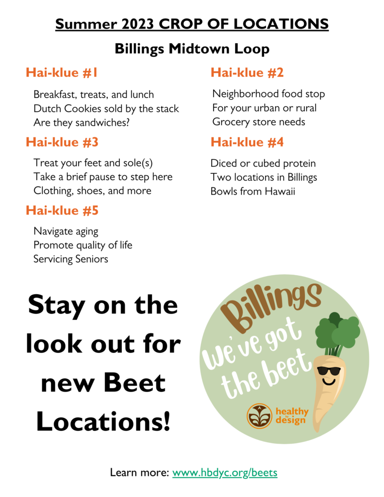 Sugar beet statues will be “planted” in walkable areas throughout town each season. See if you can decipher the “hai-klues” (clues written in haikus) below and find them all before they’re harvested and planted in a new location! The goal of this effort is to promote family-friendly physical activity and to create a sense of pride in Billings one step at a time.