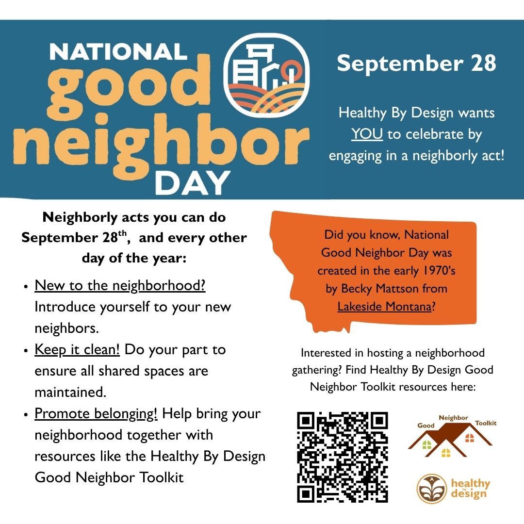 On September 28th, we invite you to focus on creating connections in your community. Whether that be taking extra care to smile and wave at those in your neighborhood, or using a Healthy By Design Good Neighbor Toolkit to plan a gathering, we encourage you to consider the positive impact that strong neighborhoods have on Yellowstone County. Learn more at www.hbdyc.org